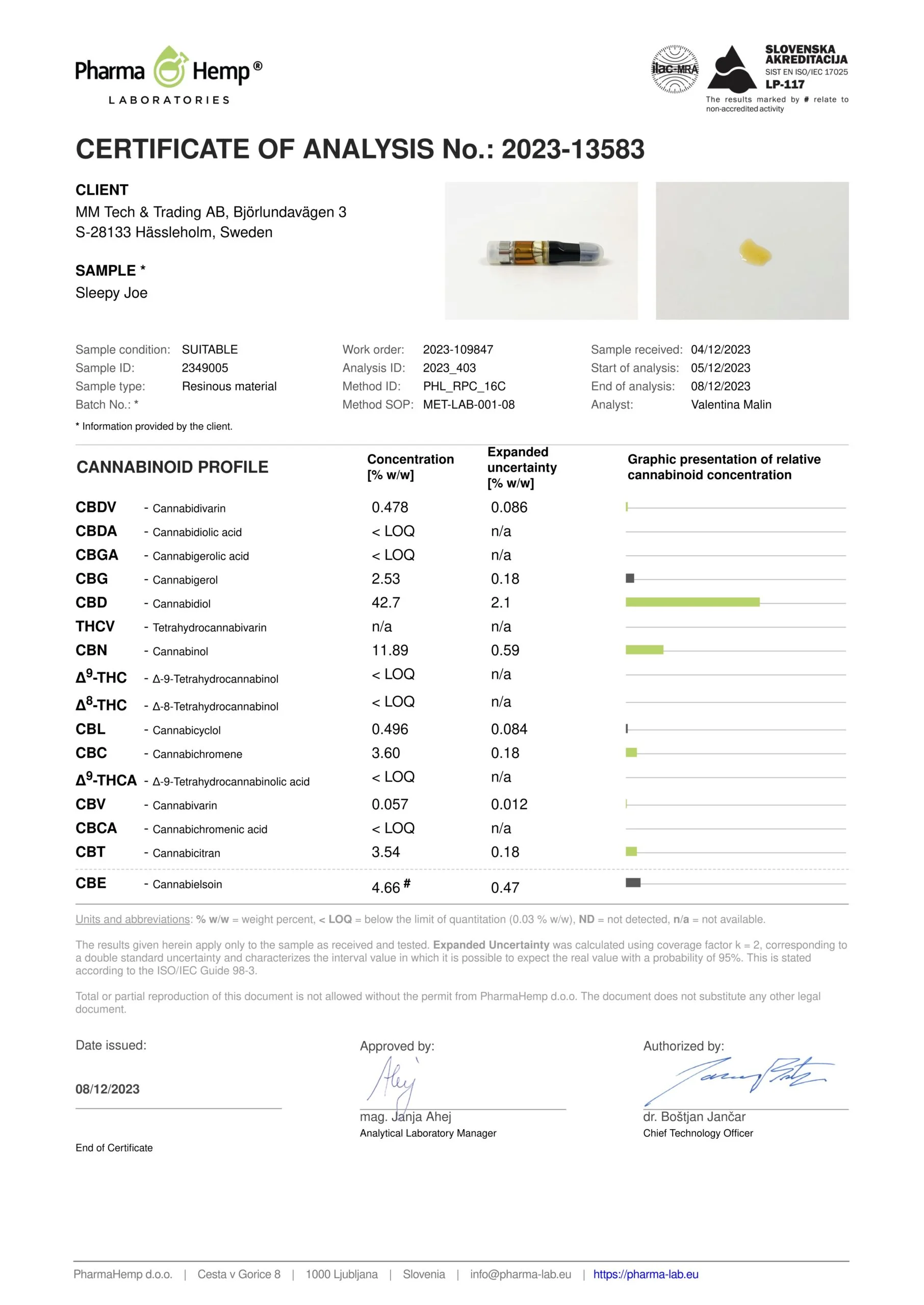 Live resin med 45% CBD, 13% CBN, 4% CBC og 1,5% CBG, sammen med 10% naturlige terpener. Produktet er helt fri for syntetiske cannabinoider og består udelukkende af naturlige ingredienser af højeste kvalitet.